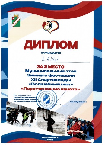Диплом за 2 место в перетягивании каната в Муниципальном этапе Зимнего Фестиваля XI Спартакиады "Волшебный мяч" команде учащихся МБОУ "Краснокамская адаптивная школа-интернат" |