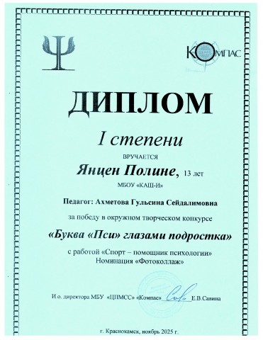 Дипло I степени за победу в окружном творческом конкурсе "Буква "ПСИ" глазами подростка" в номинации "Фотоколлаж" с работой "Спорт - помощник психологии"