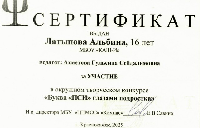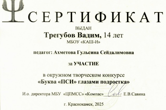 Сертификат за участие в окружном творческом конкурсе "Буква "ПСИ" глазами подростка"