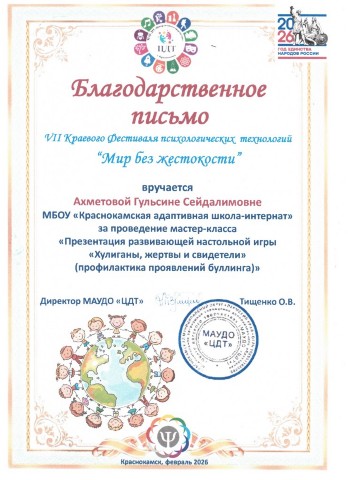 Благодарственное письмо VII Краенвого Фестиваля психологических технологий "Мир без жестокости" за проведение мастер-класса "Презентация развивающей настольной игры "Хулиганы, жертвы и свидетели" (профилактика проявлений буллинга"
