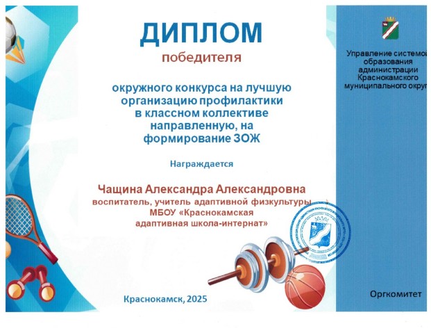 Диплом Управления системой образования Администрации Краснокамского муниципального района за II место в районном конкурсе на лучшую организацию профилактики в классном коллективе, направленной на формирование здорового образа жизни в номинации "Презентация"