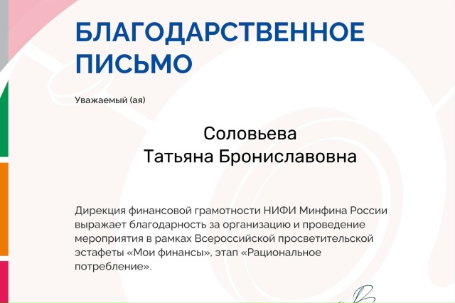 Благодарственное письмо за организацию и проведение мероприятия в рамках Всероссийской просветительской эстафете "Мои финансы", этап "Рациональное потребление"