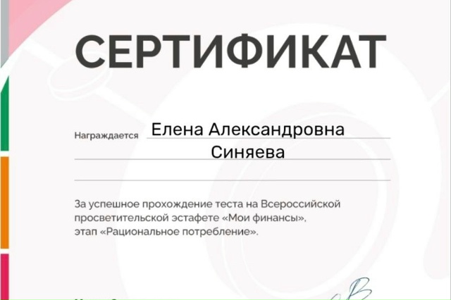 Сертификат за успешное прохождение теста на Всероссийской просветительской эстафете "Мои финансы", этап "Рациональное потребление"