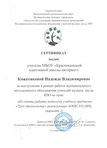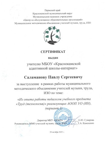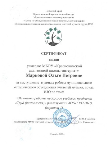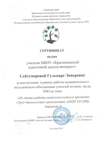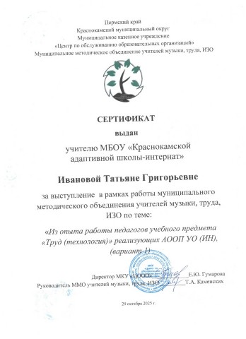 Сертификат за выступление в рамках работы муниципального метоического объединения учителей музыки, труда и ИЗО "Из опыта работы педагогов учебного предмета "Труд (технология)", реализующих АООП УО (ИН), (вариант 1)"