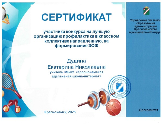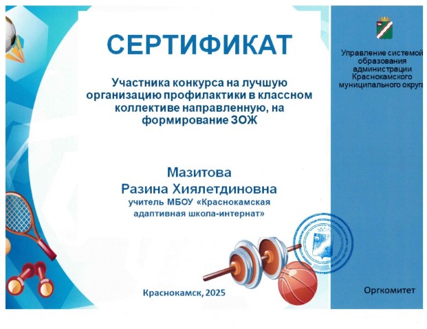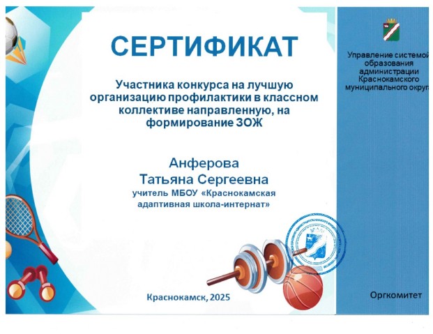 Cертификат участника конкурса на лучшую организацию профилактики в классном коллективе, направленную на формирование ЗОЖ,