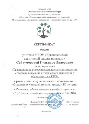 Сертификат за мастер-класс "Традиционное рукоделие, как инструмент развития моторики, внимания и творческого мышления у обучающихся с ОВЗ" в рамках работы муниципального метоического объединения учителей музыки, труда и ИЗО