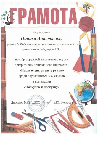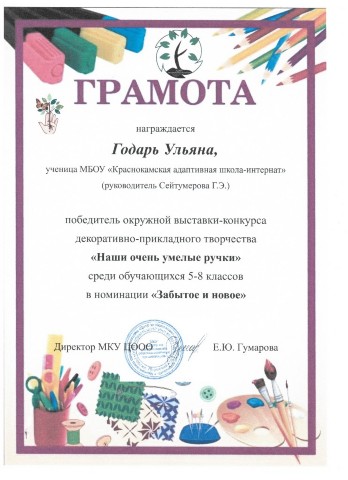 Грамота победителю окружной выставки-конкурса декоративно-прикладного творчества "Наши очень умелые ручки" среди обучающихся 5-8 классов в номинации "Забытое и новое"