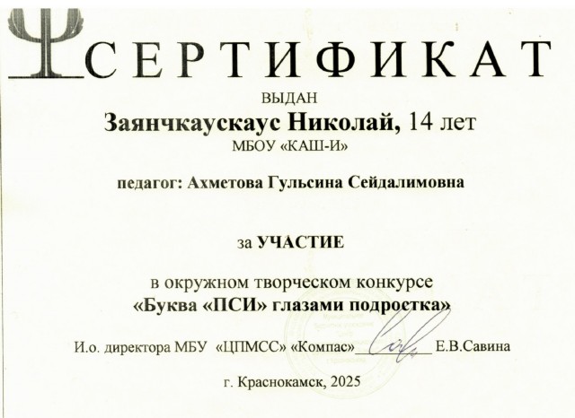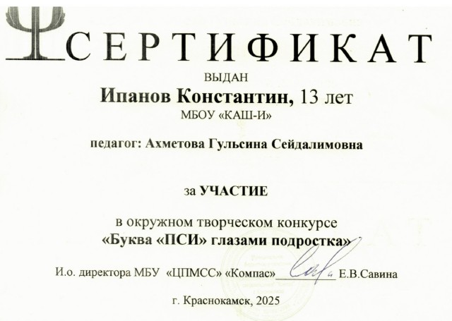 Сертификат за участие в окружном творческом конкурсе "Буква "ПСИ" глазами подростка"